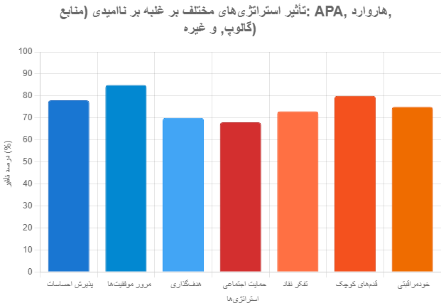 این نمودار نشان میدهد که مرور موفقیتها (85٪) و قدمهای کوچک (80٪) بیشترین تأثیر را دارند، در حالی که همه استراتژیها بهطور کلی تأثیر قابلتوجهی بر تابآوری دارند.